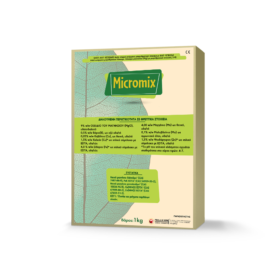 Micromix contains Organic Iron, Magnesium, Zinc, Cobalt, Copper as well as Magnesium, Boron and Molybdenum salts. Contributes to the prevention and treatment of nutrients in all crops.